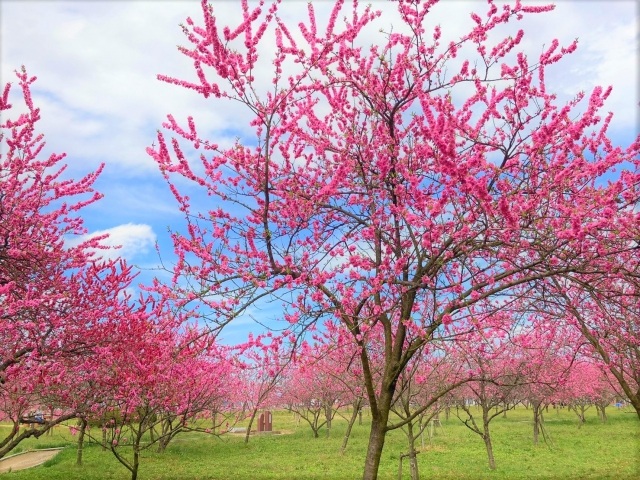 古河公方公園の広大な敷地に、早咲きの矢口を中心に、源平、菊桃など6品種約1,800本の花桃が植えられています。これらの花が、ピンクや白、赤といった鮮やかな濃淡のグラデーションを描き出し、桃源郷のような美しい景観が広がります。